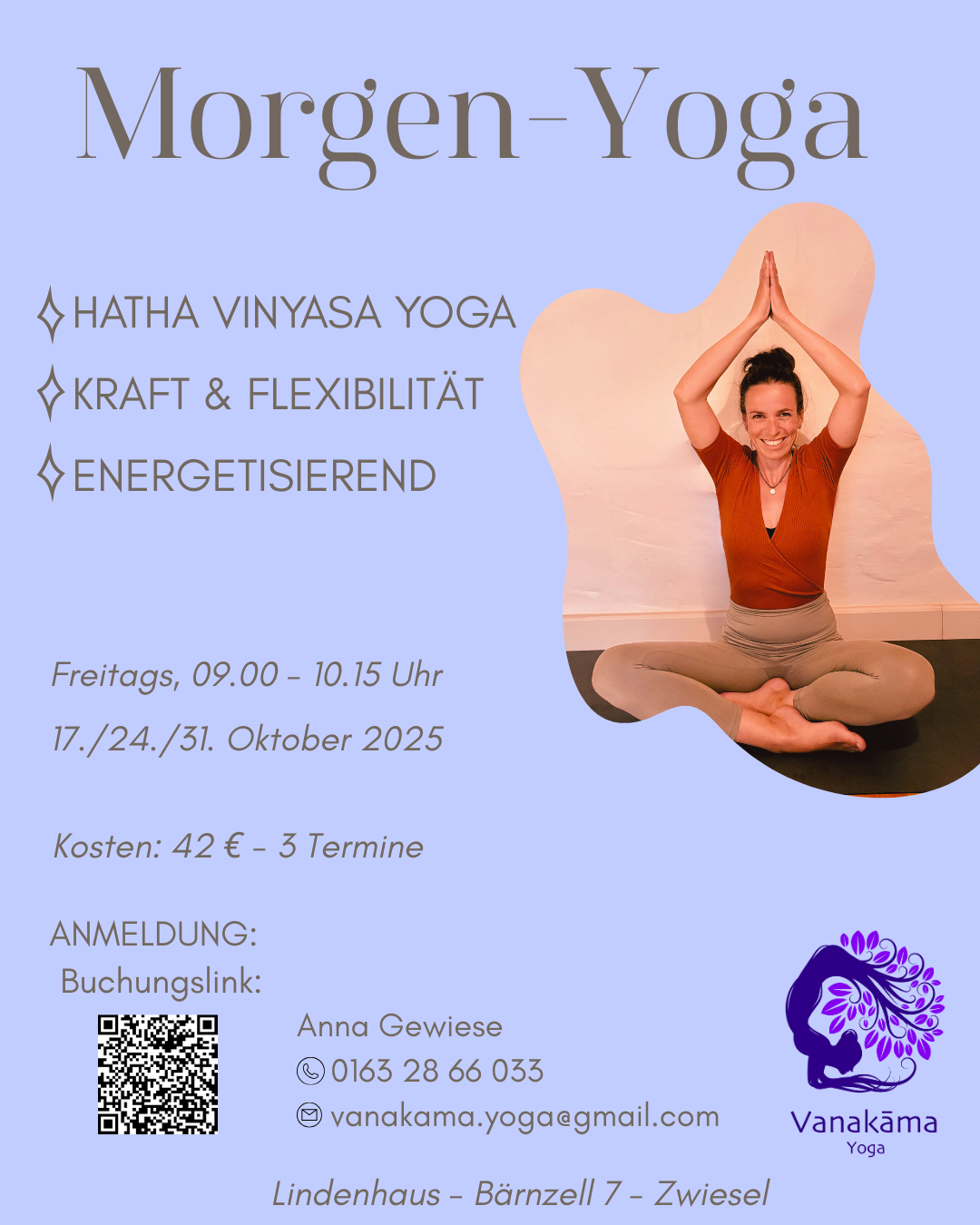 Hatha Vinyasa Yoga. Kraft & Flexibilität, energetisierend. Freitags 09.00 bis 10.15 Uhr. 17./24./31.Oktober 2025. Anmeldung bei Anna unter vanakama.yoga@gmail.com. ![]() |